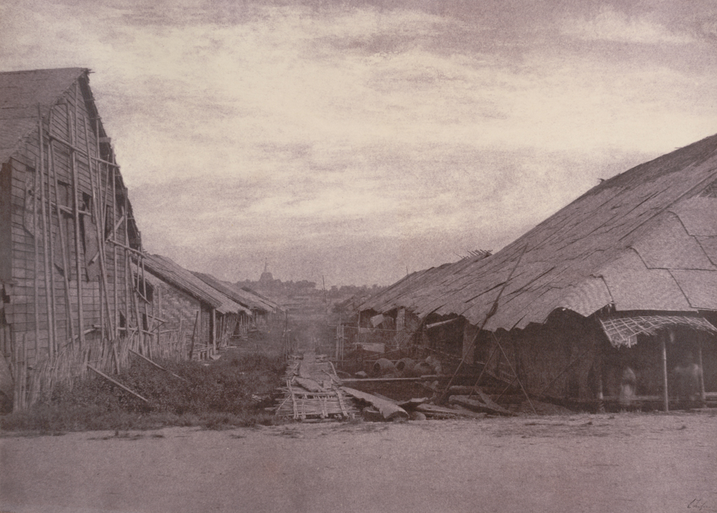 In 1855, Rangoon was in the midst of transition. A few years earlier, the British announced their plans to build a new, modernized colonial city on this site, which had been damaged by fires, floods, and war. In this photograph, Tripe framed a distant view of the Shwe Dagon Pagoda between two rows of simple buildings and a makeshift raised wooden walkway, all of which would soon be demolished.
