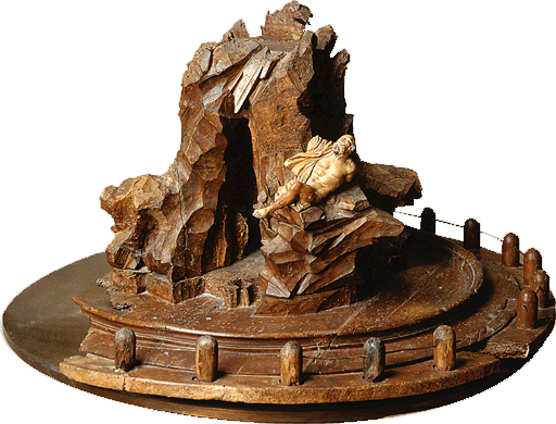 This model, circa 1650, is an early study for the final design for the Four Rivers Fountain. The sculpted rock of the fountain base is represented with wood, and the one surviving figure, representing the Plata River, is modeled in clay. The design of the finished fountain differs slightly from that of the model: the circular form of the basin became an oval, and the openings in the rock were made more irregular.