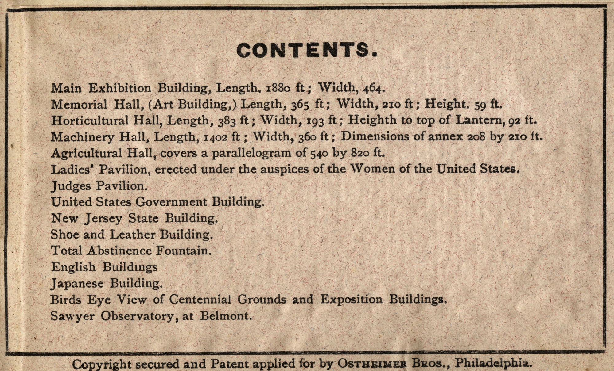 The contents page of the souvenir album lists 12 exhibition buildings, Sawyer Observatory, the Total Abstinence Fountain, and a view of the grounds and buildings. The Centennial Park encompassed more than 200 buildings.