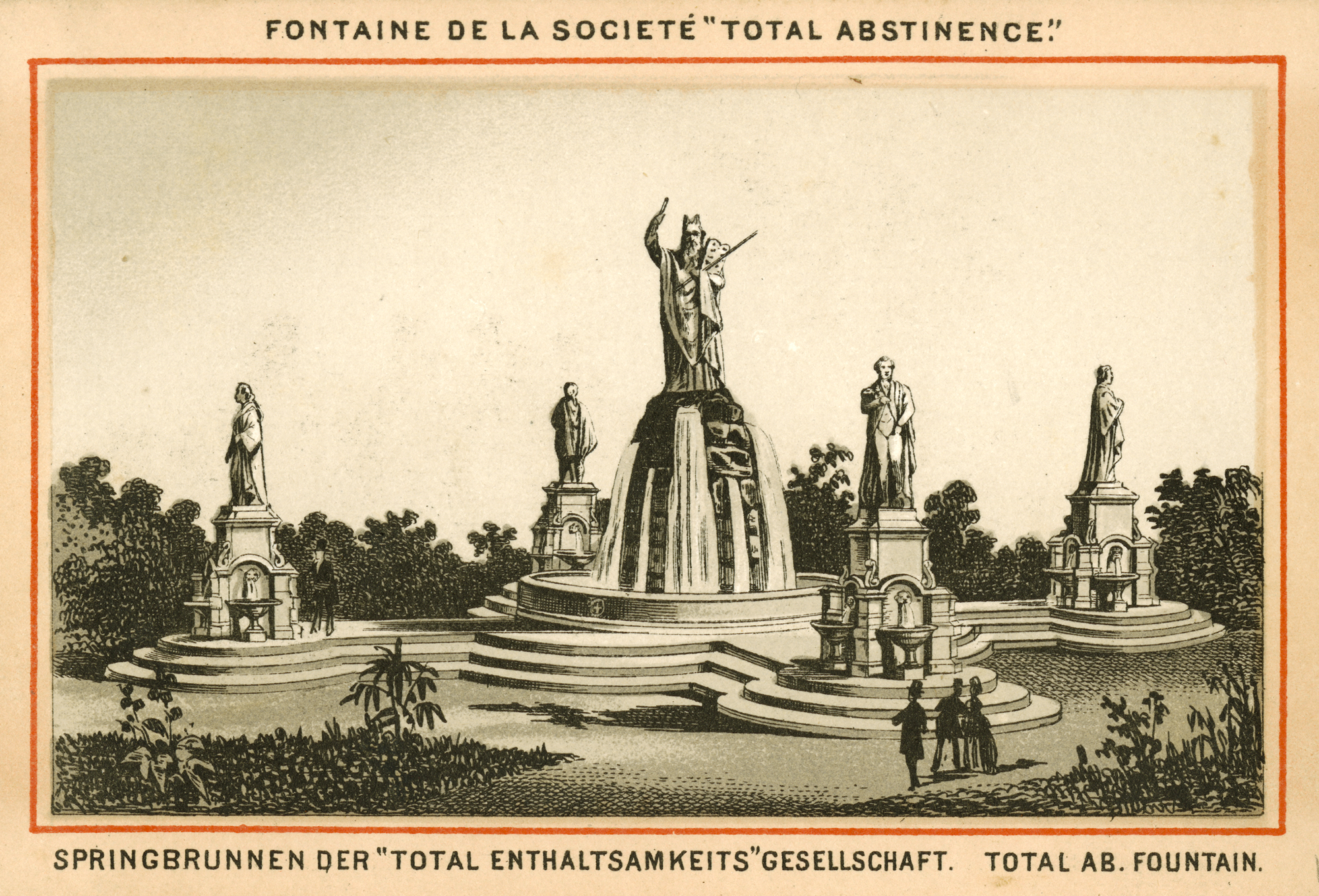 This fountain was funded by the Catholic Total Abstinence Union of America. It portrays Moses (the central figure), early prominent Catholic Americans Charles Carroll of Carrollton and Archbishop John Carroll, Irish temperance proponent Father Theobold Mathew, and Commodore John Barry, "Father of the American Navy." The fountain still stands in West Fairmount Park.