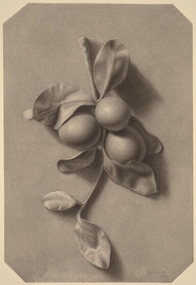 William Michael Harnett, A Sprig of Plums, 1873, charcoal and black chalk with stumping and scratching out on cream wove paper, Collection of Mr. and Mrs. Paul Mellon, 1985.64.98