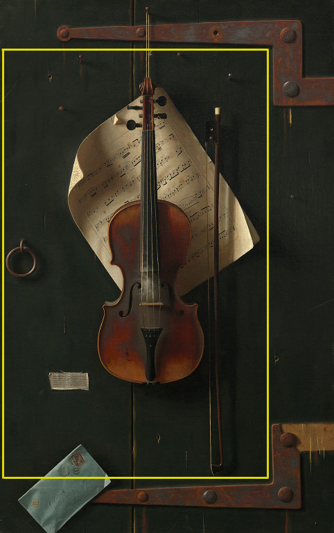 Harnett positioned each element in The Old Violin to achieve a precise balance. For example, while the violin hangs slightly off-center, the hinges are bent to frame it perfectly within the overall composition. The instrument bisects the angled sheet music, and the blue envelope echoes the music's tilt. The violin bow lines up exactly with one of the door slats; the news clipping, placed like an exhibition label for the violin, further stabilizes the work.