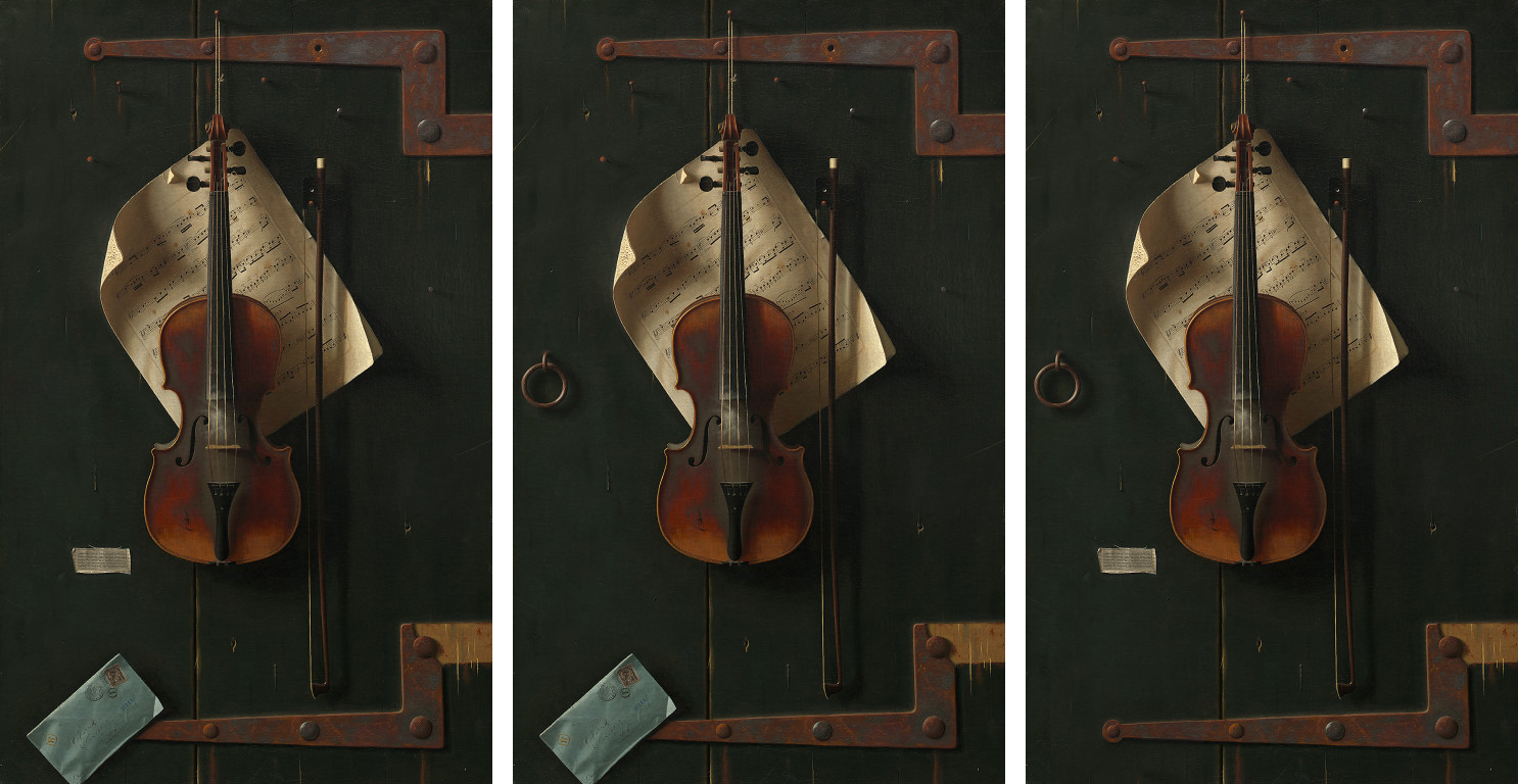 Peto's Old Violin, with its broken string and damaged body, hangs at a precarious angle, while Harnett's (in better condition) is squarely suspended on the door. Both paintings speak to the effects of time's passage, the nostalgic associations of music, and the interplay between illusion and reality.