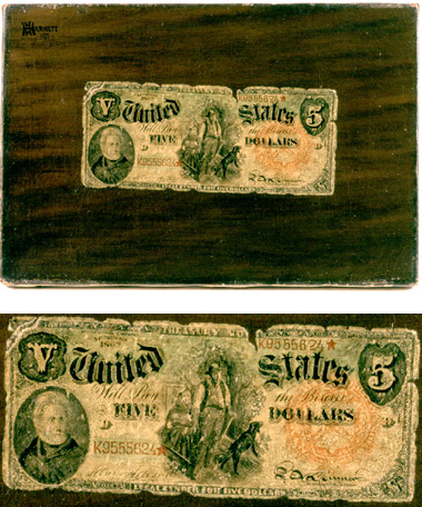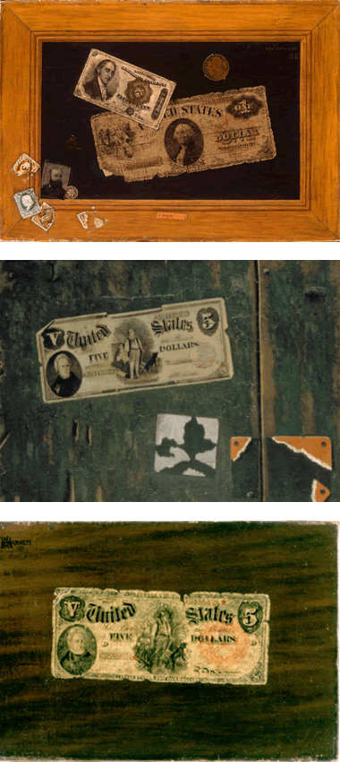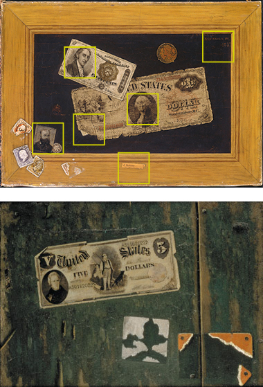 (bottom) William Michael Harnett, Still-Life Five Dollar Bill, 1877, Philadelphia Museum of Art, Alex Simpson Jr. Collection