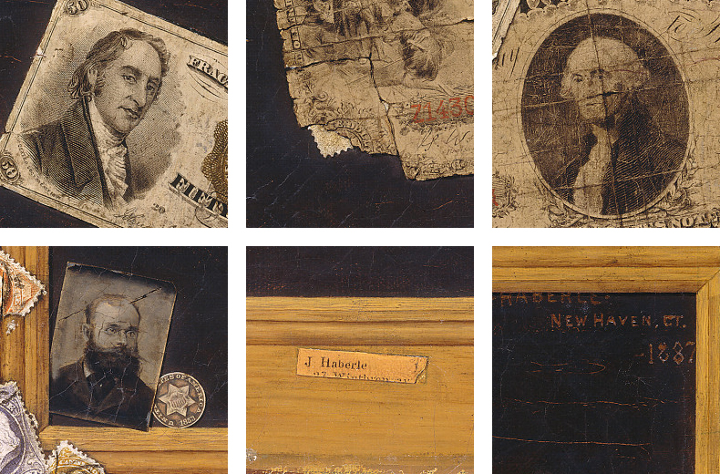 Haberle created a close counterfeit in Imitation, but he did not try to hide his identity and signed the work in three ways. First, with his painted photograph, second, with the torn paper label marked J. Haberle on the front of the frame, and third, in the upper right corner, with a cropped-off version of his name, followed by "New Haven, Ct. 1887." He left no doubt about who "perpetrated" the painting. (He also it made clear that the currency was not real by entitling the work Imitation.) The cracked tintype photograph looks real, and to enhance the illusion, Haberle stuck it into the edge of the "frame." Haberle used visible horizontal and vertical strokes and highlights on the picture frame to simulate wood grain.