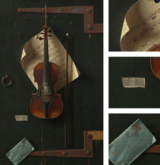 The Old Violin demonstrates Harnett's crisp, linear style. There are virtually no signs of brushwork. He used special tools and techniques to make the hinges, news clipping, twine, and stamp.