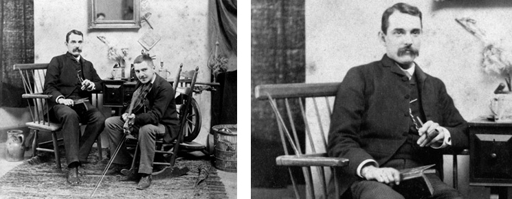 Surrounded by the everyday objects that appear in his work, John F. Peto (violin at his chin) poses in his studio with friend and fellow artist William Harnett. Peto, an accomplished violinist and cornet player, would paint his own version of the Old Violin in 1890.