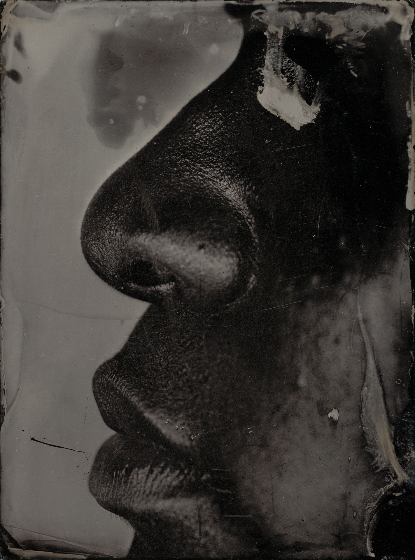 This close-up self-portrait by Myra Greene addresses the complexity of how we see other people and what we can know by seeing them. The photograph isolates and fragments a part of Greene’s face, denying us the ability to see her as a whole. The work intentionally uses a vintage photography technique called ambrotype to allude to a 19th-century version of racial profiling in which photography was used to classify facial features to support white supremacy. This photograph is part of a series titled Character Recognition. Greene began this project in 2006, noting, “Confronted with an up swell of bigotry both personal and public, I was forced to ask myself, what do people see when they look at me. Am I nothing but black? Is that skin tone enough to describe my nature and expectation in life?”