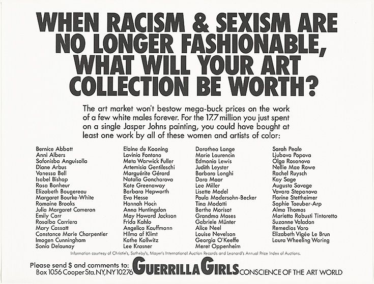 The Guerrilla Girls is an anonymous and ever-changing group of women artists, curators, and writers who use performances, public demonstrations, and visual art to advocate for greater representation of diverse artists in museums, galleries, art publications, and other creative pursuits. The Guerrilla Girls dress in full-body gorilla suits to perform guerrilla actions, such as protests, on behalf of women and other underrepresented groups in the art world. The costumes disguise their real identities and allow them to assume the pseudo-identities of famous women artists. This satirical gesture familiarizes women artists’ names while also preventing the individuals from being blackballed by the institutions against which they protest.