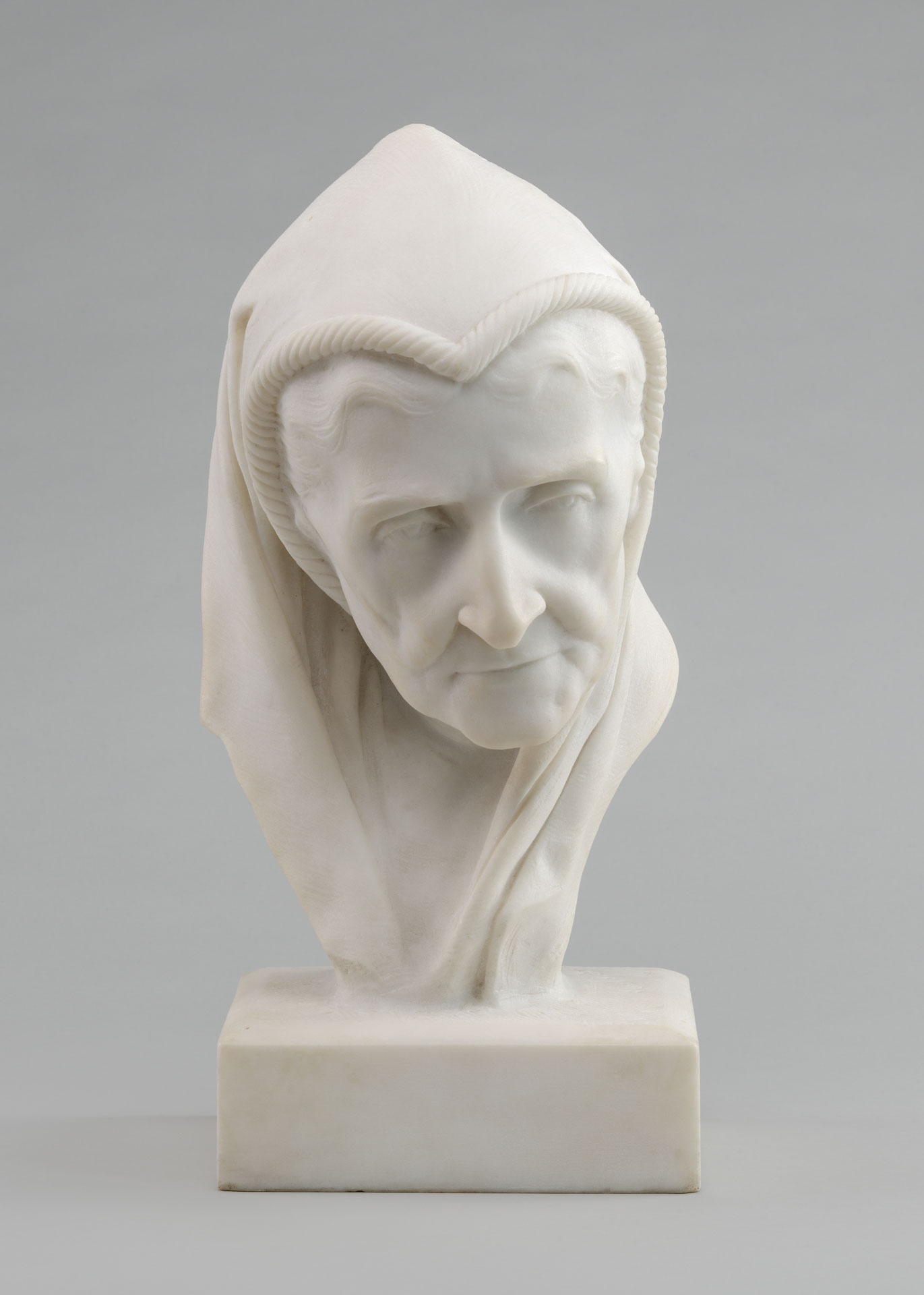 Huntington occasionally turned to more personal projects, as represented by this sensitive and dignified marble bust of her mother, Audella Beebe Hyatt (1840–1932). Audella was also an artist and encouraged Anna’s artistic talents. Sculptural busts of elder women are significantly less frequent than those of elder men.