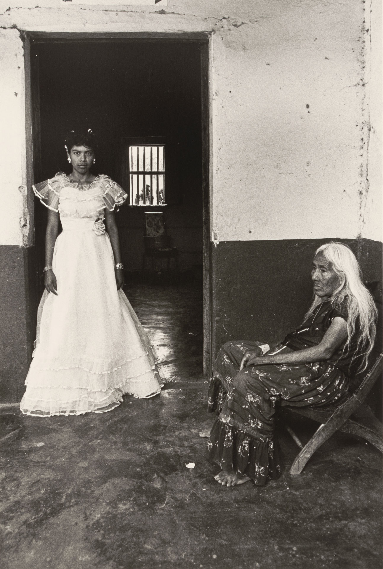 In this image, a girl is dressed formally for her fiesta de quince años, or quinceañera, to mark her entry into womanhood. This special recognition of the 15th birthday is a custom in Mexican and other Latin American cultures. Graciela Iturbide contrasts this celebration of emerging adulthood with the presence of the girl’s grandmother seated in the foreground, whose appearance suggests a life of hardship. The expressions of the two relatives are distant and difficult to read.