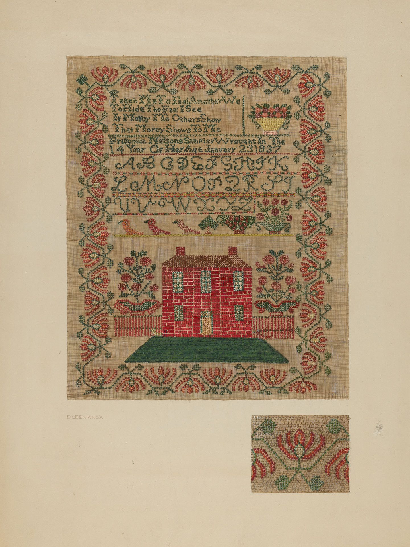 This drawing depicts an example of needlework from the late 19th century. Young women made samplers to practice needle arts and to demonstrate different embroidery stitches. If you enlarge the drawing (which is colored with gouache paint), you will see that it is so fine and realistic that it almost appears to be a photograph. The sampler includes a brick house, likely the 14-year-old maker’s home, and a quote from 18th-century English poet Alexander Pope (with some incomplete letters): “Teach me to feel another’s woe / To hide the fault I see / In mercy I to Others show / That Mercy shows to me.”