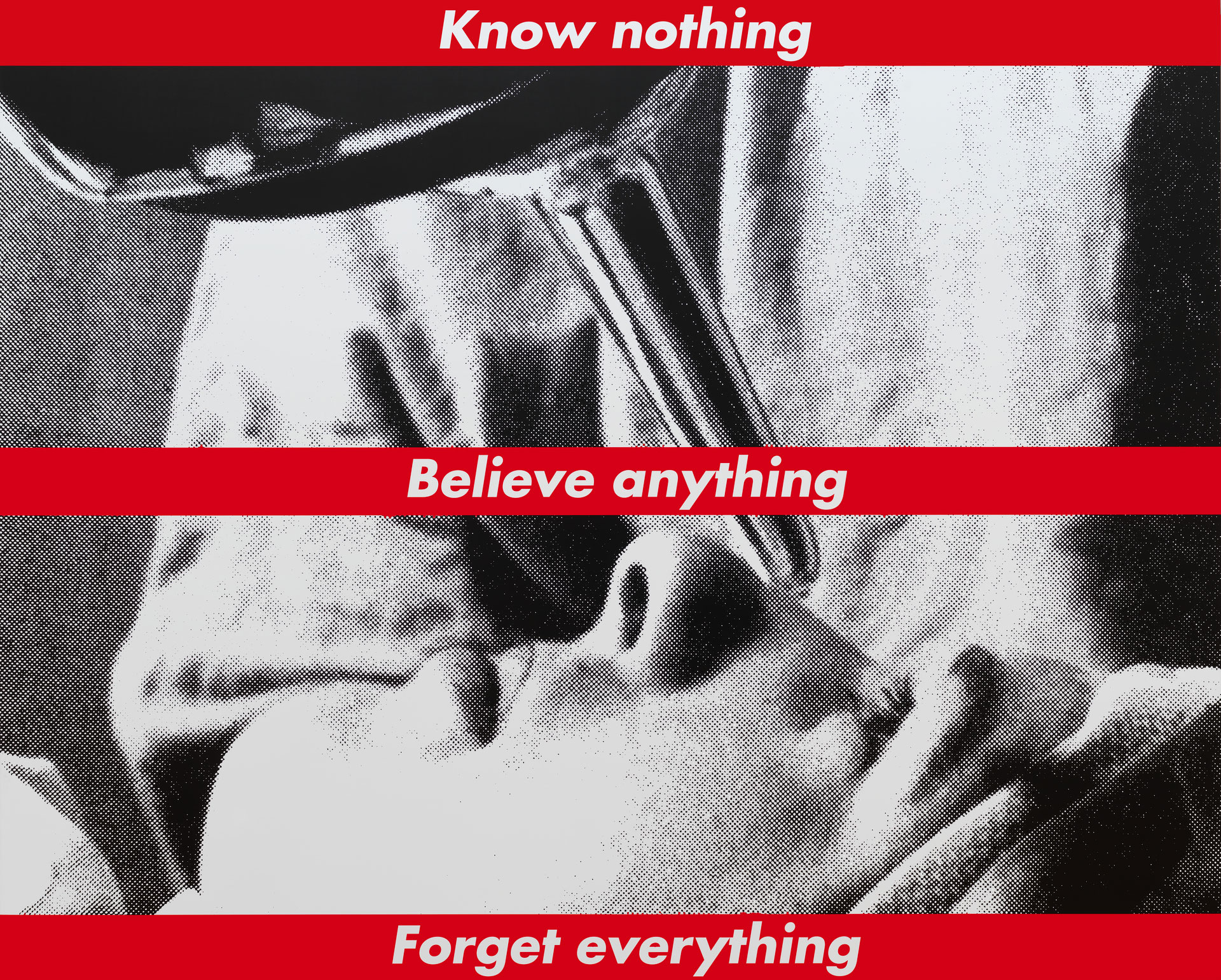 Barbara Kruger got her start working as a graphic designer at Glamour magazine in the late 1960s. Before digital page layout existed, graphic designers made “paste-ups” comprising collaged elements—such as titles, texts, captions, and images—to create a designed page. The collage was then photographed for reproduction in the magazine. Kruger has riffed on this process in her work as a visual artist. Using a distinctive graphic style, she exposes power dynamics in her personal life, work, and politics. This image depicts a woman receiving a mysterious treatment to her eye administered by the faceless figure of a medical professional in the background. The three red bars with text divide the medical instrument in the top half from the receptive, passive woman in the bottom half with the ominous text: “Know nothing / Believe anything / Forget everything.” What might those words imply?