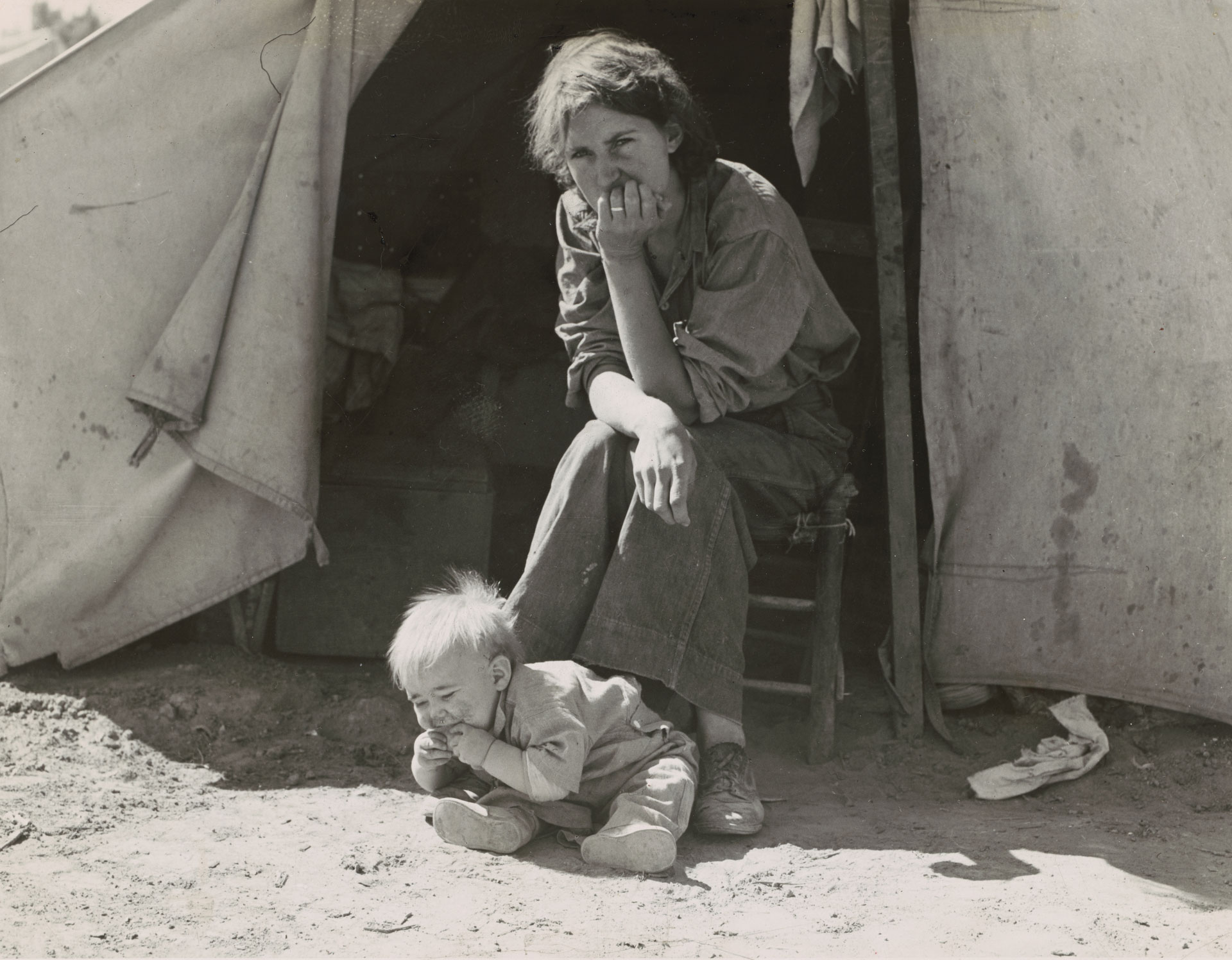 Dorothea Lange’s photographs of people impacted by the Depression are her most well-known work. She wanted to show the public and politicians the reality and depth of the United States’ social and economic problems. Working for the Farm Security Administration, an agency created by President Franklin Delano Roosevelt to address the plight of farmers affected by the dust bowl, Lange made many photographs of migrants who traveled to California during the 1930s seeking agricultural work. Yet work was scarce, and often migrants ended up unemployed in encampments, some set up as public relief programs. Here a young mother sits in front of her government-issued tent with her child at her feet. Her expression communicates a toughness and a kind of resignation. Lange sometimes shared her photographs with newspapers in order to draw the public’s attention to people’s suffering. On one occasion, the publication of her photographs in the San Francisco News resulted in an outpouring of 20,000 pounds of food donations for malnourished migrant workers.