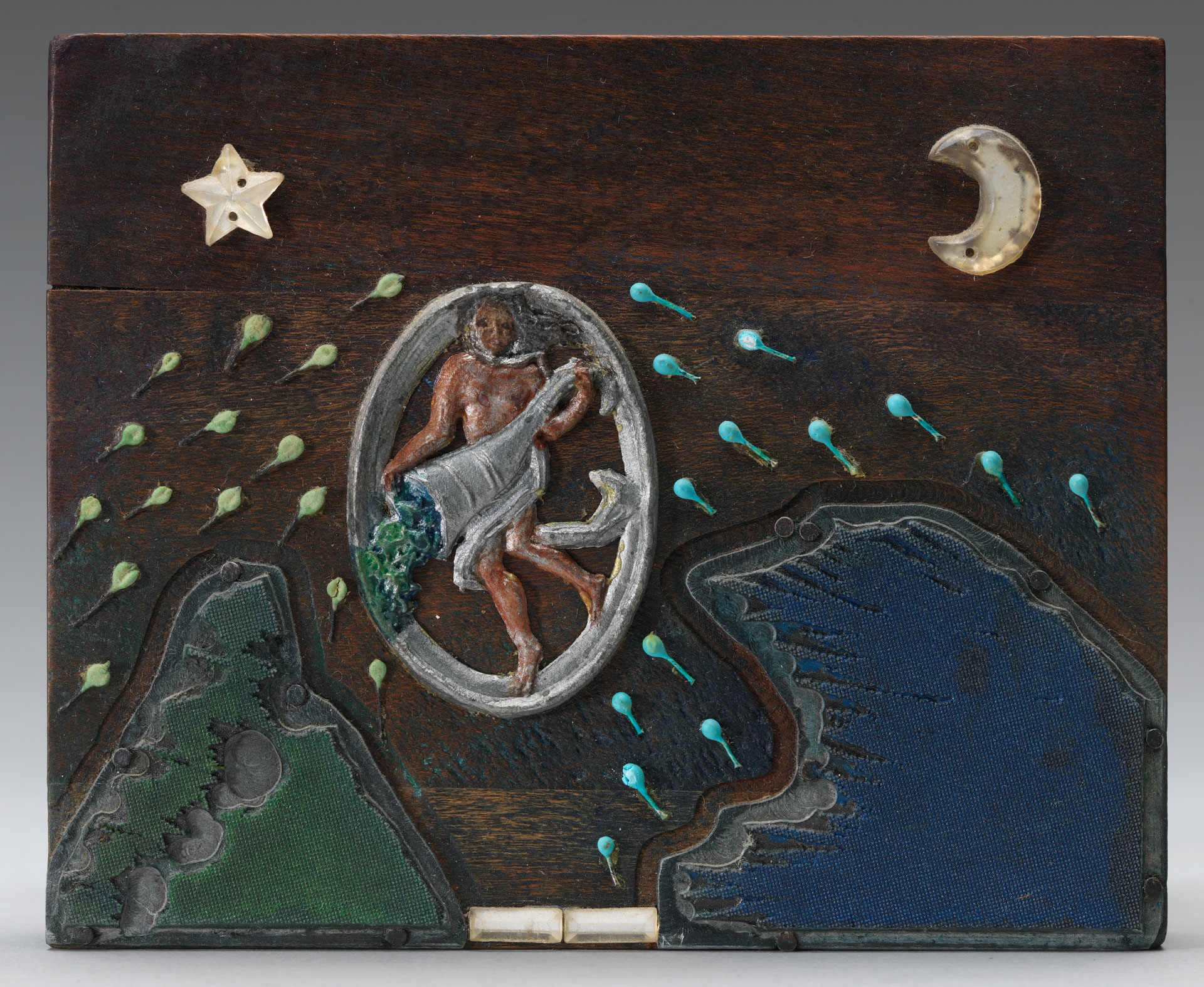 Betye Saar is a Los Angeles–based artist who mingles personal history, mythology, and folk art to reflect upon her life and the African American experience. Twilight Awakening centers on a powerful central figure who hovers between the space of sea and land, the moon and star. The work’s symbology indicates that the figure is Aquarius, the Water Bearer. The signs of the zodiac derive from Roman antiquity, visualizing the passage of time through labor and activities associated with different times of the year. The work is a three-dimensional assemblage: it is made on a wooden base of a recycled printer’s block, to which Saar added scavenged and sculpted pieces of plastic, ceramic, and glass. These personal objects, bearing marks of use and history, lend a magical power to the tiny panel measuring only 3 ¾ × 4 ½ × ¾ inches. Who are the storytellers in your life? How do they share their stories?