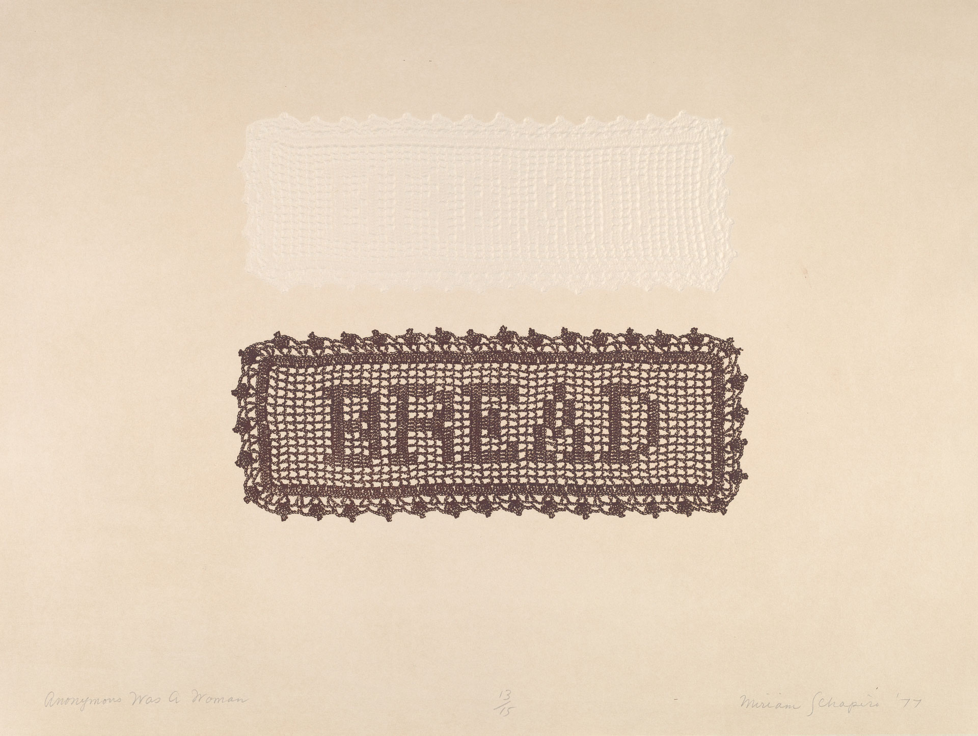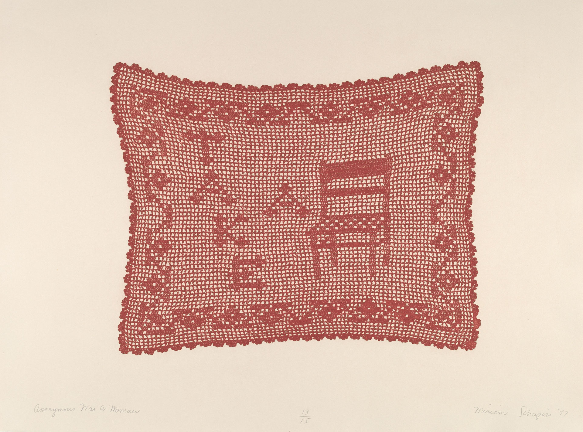 Miriam Schapiro was a pioneer of feminist art beginning in the 1970s. Feminist art gave visibility and voice to the particular conditions of women’s personal and socioeconomic lives. Schapiro’s etchings of crochet recall drawings of similar objects from the Index of American Design (IAD). Traditional, embroidered samplers and examples of fine crochet made by generations of young women—and visually documented in the IAD—embody conventional expressions of domesticity. Schapiro’s works slyly subvert those ideals while also paying homage to household labor and activities performed largely by women. This etching commands “Take a Seat,” with an image of a chair replacing the final word. It was part of a series that recognized the unseen and uncredited work of women in the home, whether sewing, mending, cooking, or cleaning.