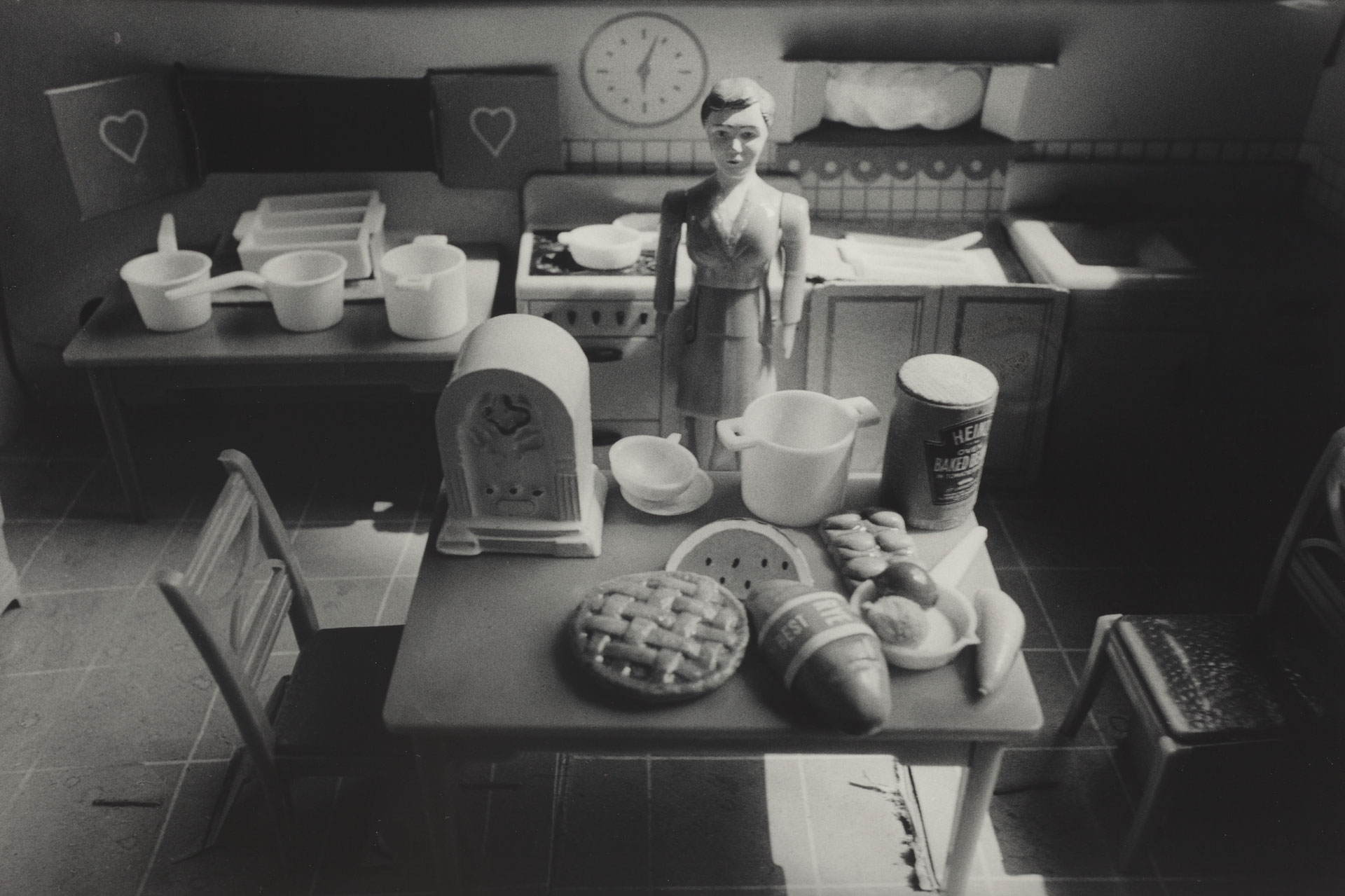 Laurie Simmons creates fictional tableaux which she carefully lights and photographs. Some are miniature scenes, such as this one of a woman/doll in a kitchen. While the picture looks like it could be a peek into a dollhouse, the way in which Simmons presents the scene suggests something off-kilter and discomfiting. The black-and-white photograph and its dramatic lighting evoke old Hollywood films of the mid-twentieth century. During that time, popular culture—including movies and toys—often reinforced gender stereotypes, depicting women in domestic roles. In Woman/Purple Dress/Kitchen, a clock shows the time as just after six o’clock: Is it early evening and the woman/doll awaits the arrival of her spouse? As is often the case with dollhouses, the proportions of the objects are slightly off. Here an array of baked goods, kitchen utensils, and a giant radio on the table are half as large as the woman/doll standing behind them.