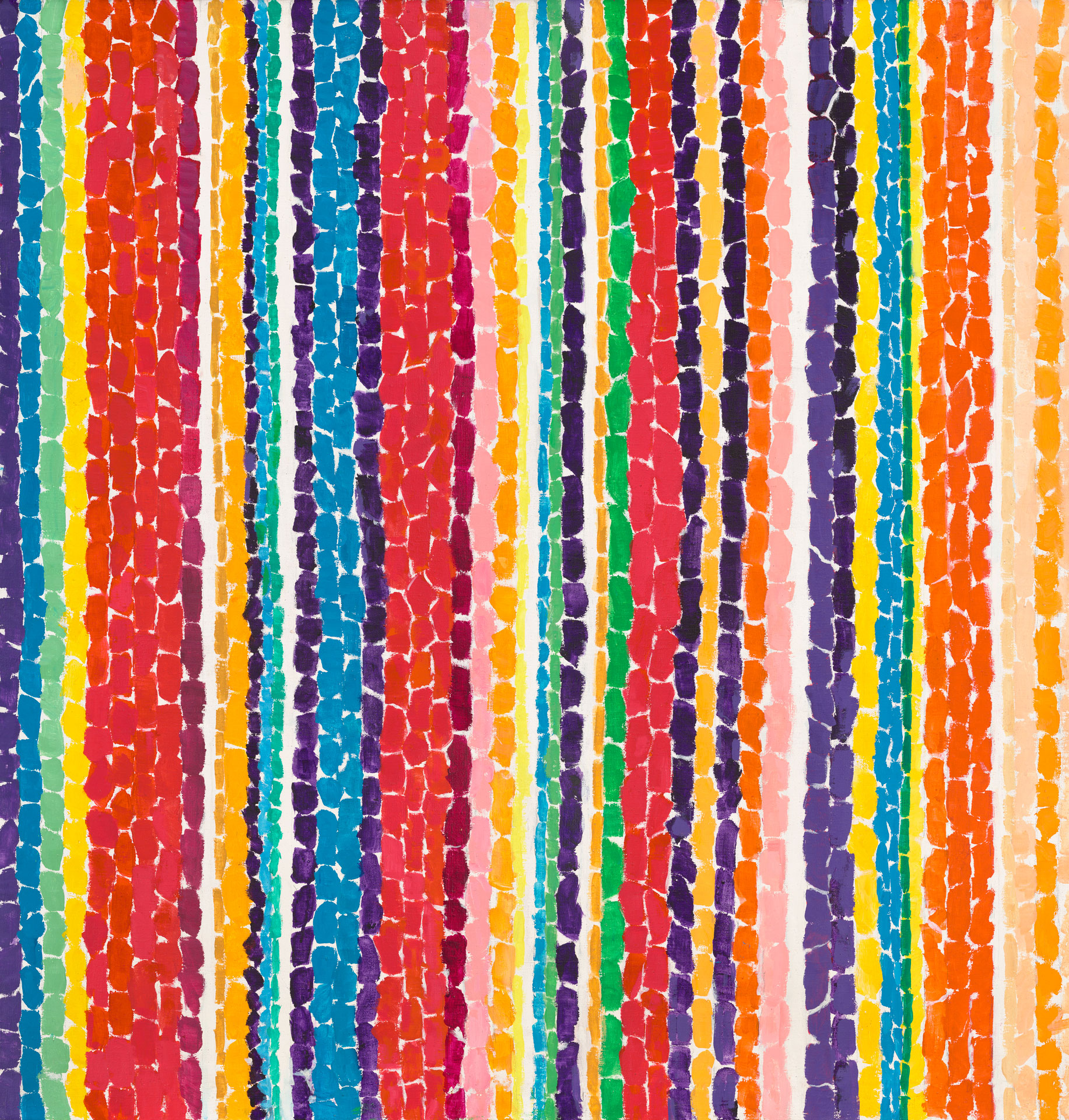 The role of color is of “paramount importance.” As Alma Thomas said, “through color I have sought to concentrate on beauty and happiness in my painting rather than on man’s inhumanity to man.” Thomas created this work when she was well into her seventies. The artist found inspiration in landscapes and flowers around her, which she stylized in shapes and patterns created with repeated, colorful brushstrokes. Her paintings are infused with personal memories and references; in this case, the work’s title refers not only to the springtime flowers that populate Washington, DC, where she lived, but also to the plucky song published in 1929 and famously recorded by Tiny Tim in 1968.