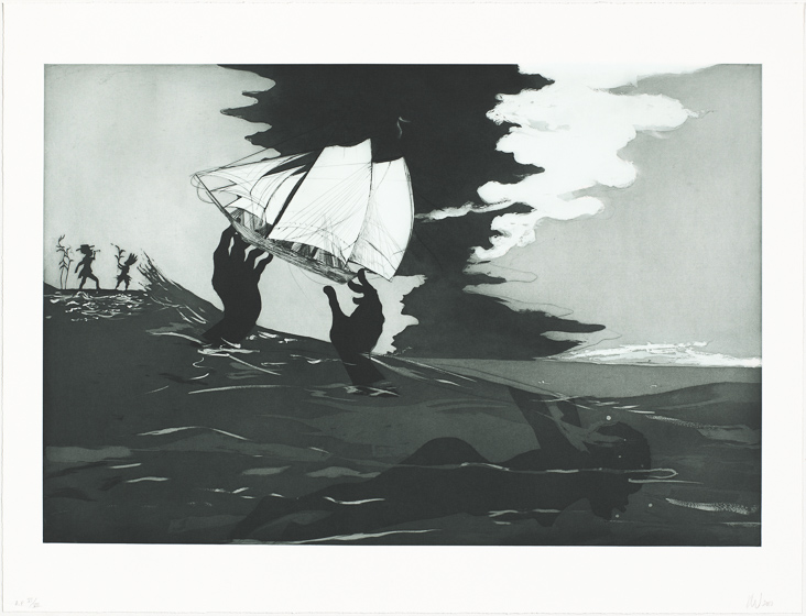 This etching is part of a series—An Unpeopled Land in Uncharted Waters—whose six works refer to the transatlantic slave trade. Its title, no world, may be a pun on “New World,” referring to dislocation and an in-between state. The image, resembling an illustration from a graphic novel, communicates a narrative of mythological proportion. The sailing ship, alluding to a vessel used in the forced transport of African people to the Americas, is being lifted out of heaving seas by giant black hands. A dramatic column of black and white clouds clash in the sky above, suggesting conflict, while beneath the water, a floating female figure faces downward. A long wave moves toward the shore, upon which stand two distant, caricatured silhouetted figures with some spindly plants, perhaps a reference to the 19th-century agricultural economy that depended on the labor of enslaved people. Kara Walker’s work addresses the violent, traumatic history of slavery and its legacy. A female figure is a prominent part of this work. Why might Walker have made the choice to include this figure, and to give her prominence in the foreground?